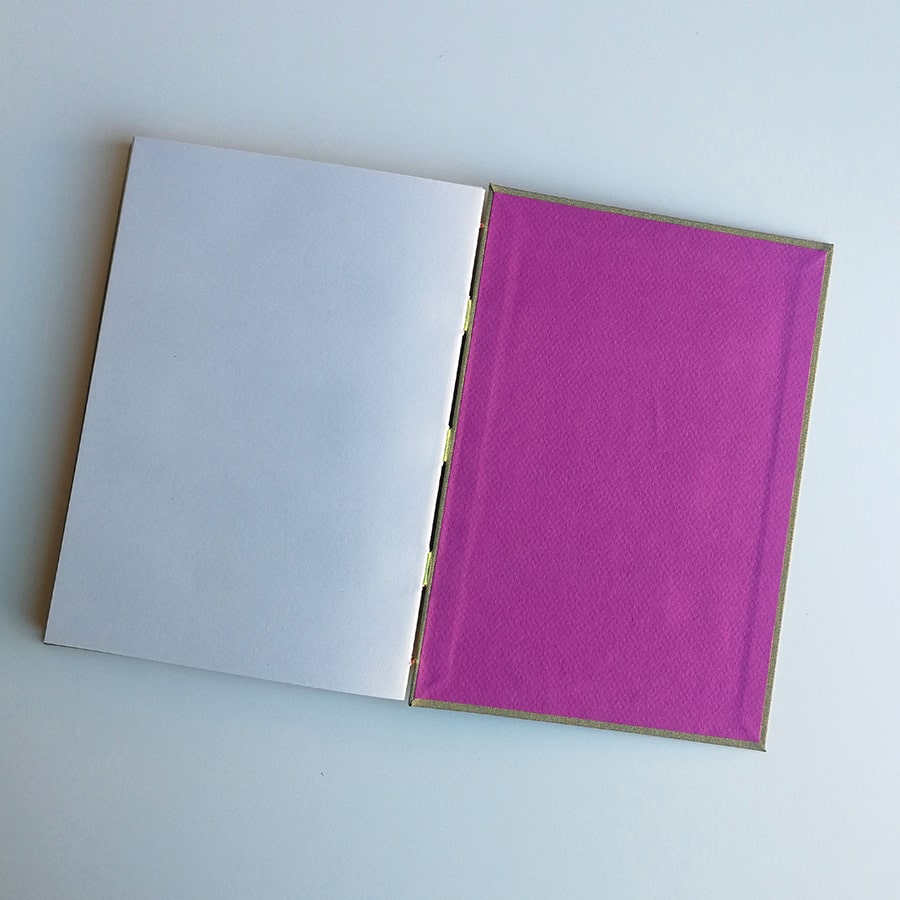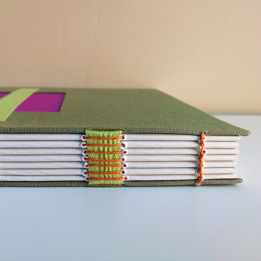 · Ventana interior en morado, cinta de algodón verde claro e hilo en costuras vista y en lomo color naranja. Guardas interiores en morado.