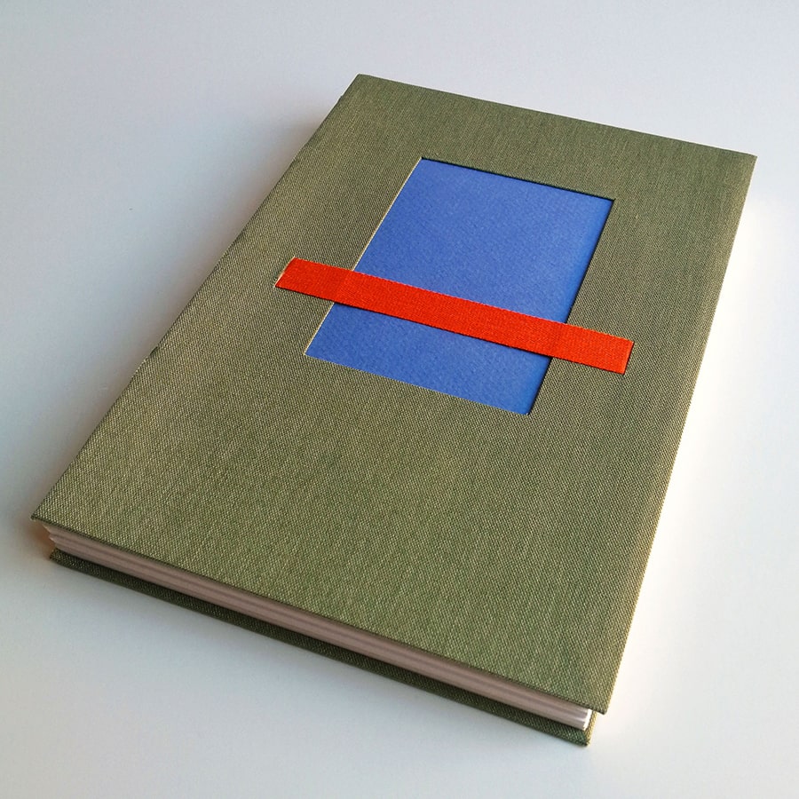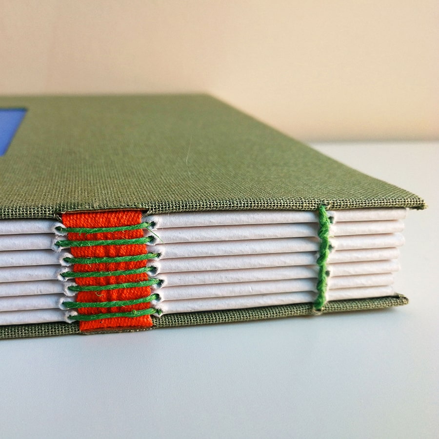 · Ventana interior en azul, cinta de algodón naranja e hilo en costuras vista y en lomo color azul. Guardas interiores en azul.